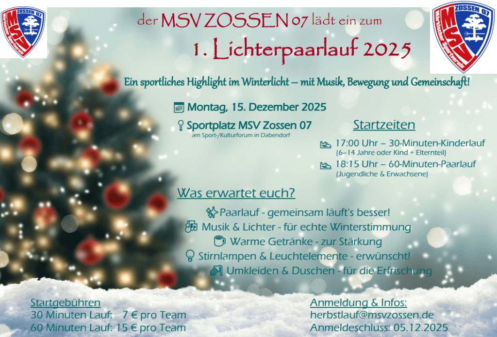 1. Lichterpaarlauf 2025 Verfasst von Tobias Petruschke am 24. November 202521. November 2025 Der MSV Zossen 07 lädt am 15. Dezember zum 1. Lichterpaarlauf ein, Anmeldeschluß ist der 5. Dezember, hier die Ausschreibung: Entdecke mehr von Teltow-Fläming Cup Melde dich für ein Abonnement an, um die neuesten Beiträge per E-Mail zu erhalten. Gib deine E-Mail-Adresse ein ... Abonnieren Teilen mit: Auf Facebook teilen (Wird in neuem Fenster geöffnet) Facebook Drucken (Wird in neuem Fenster geöffnet) Drucken Einen Link per E-Mail an einen Freund senden (Wird in neuem Fenster geöffnet) E-Mail Auf WhatsApp teilen (Wird in neuem Fenster geöffnet) WhatsApp Gefällt mir Wird geladen …